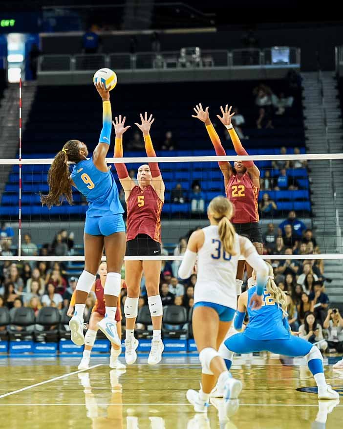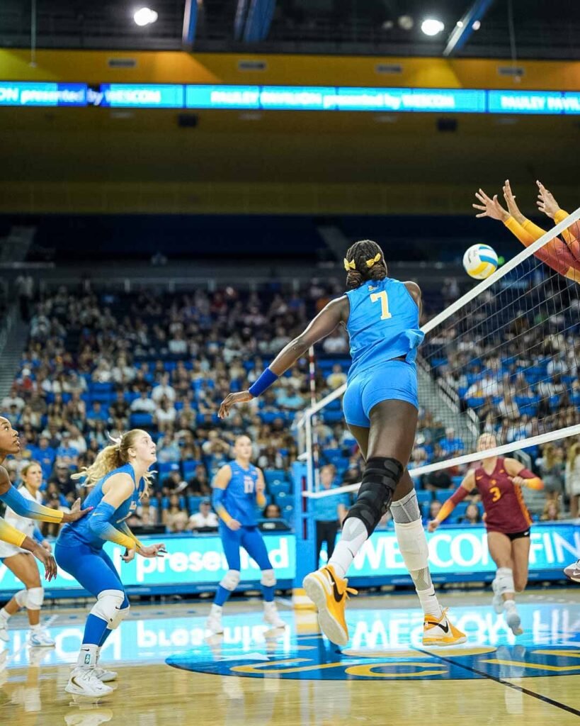 Today’s highly anticipated UCLA–USC women’s volleyball showdown at Pauley Pavilion delivered in spades, with the Bruins sweeping the Trojans in straight sets, 25-21, 25-22, 25-15. UCLA’s dominance was evident at the net, where they racked up nine total blocks and held USC to a season-low hitting percentage of .115.